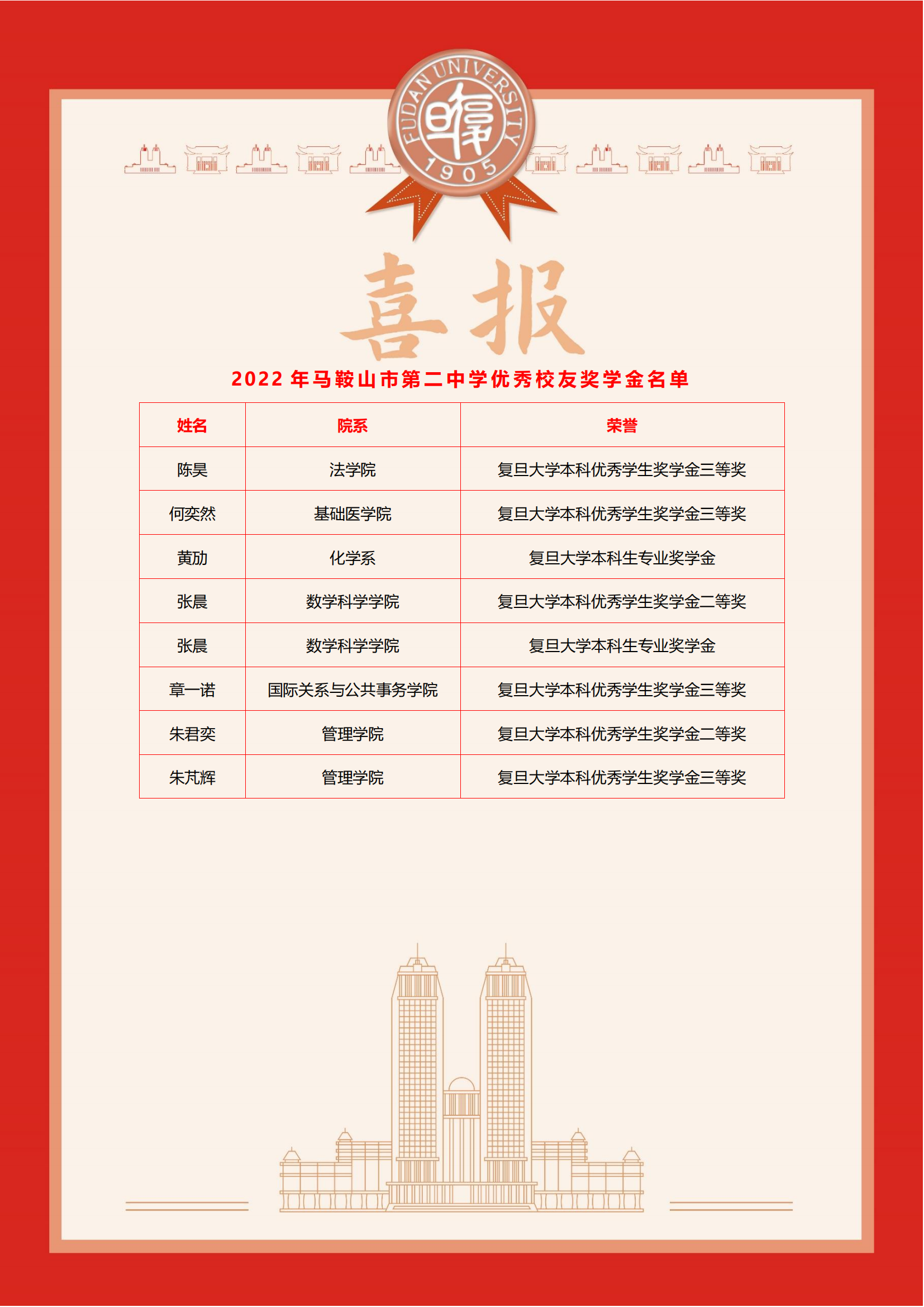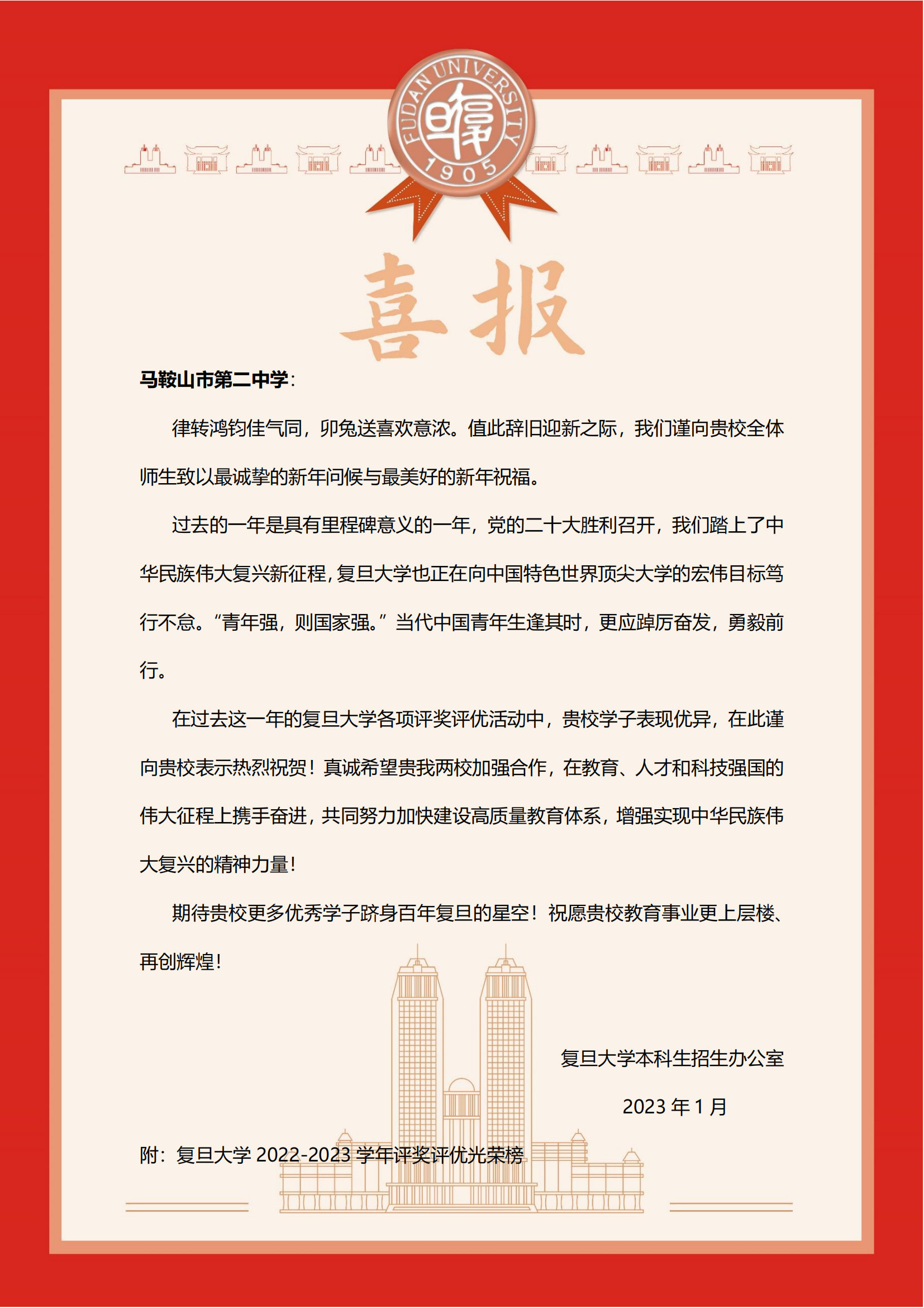 複旦大學向我校發(fā)來喜報